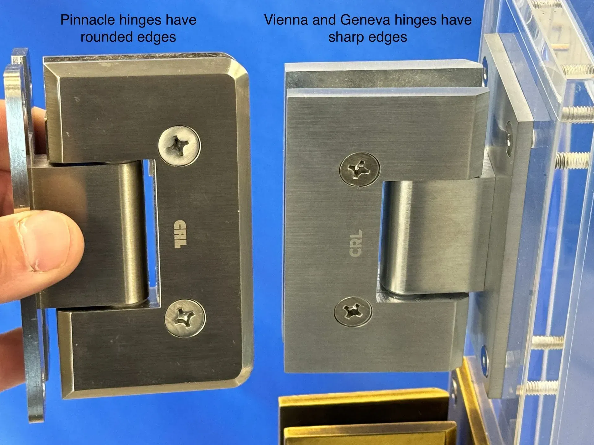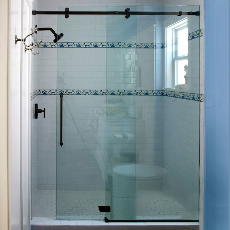 The Door('s) is often made with 1/4" thick glass without a frame (the frame is still around the floor wall and header. And if there is a fixed sidelight it is often made with 3/16" thick glass. Handles and hardware securely attached through holes in the glassSilhouette sliding doors offer the most options in the industry. All shower doors use the highest quality solid brass and stainless steel hardware.