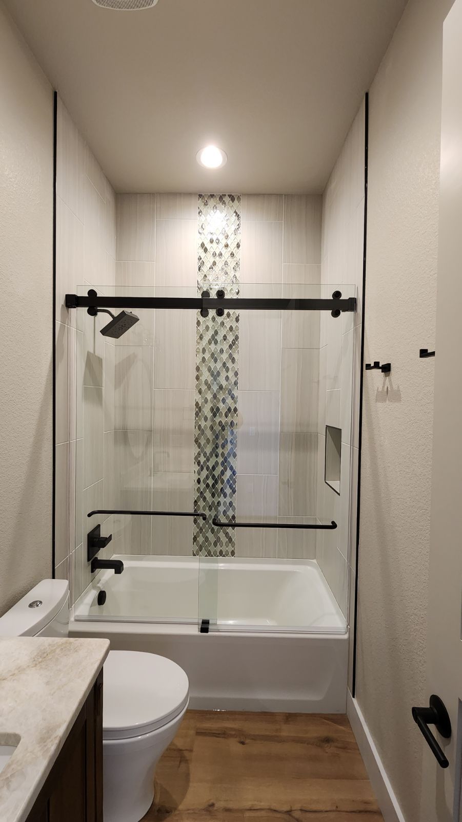 The return wall is a partial tiled wall the the upper half is glass. The glass the is turning and returning to the wall acts as support to hold the Serenity Bar. Sleek minimal hardware creates a frameless design, giving the enclosure an impression of floating in mid-air.